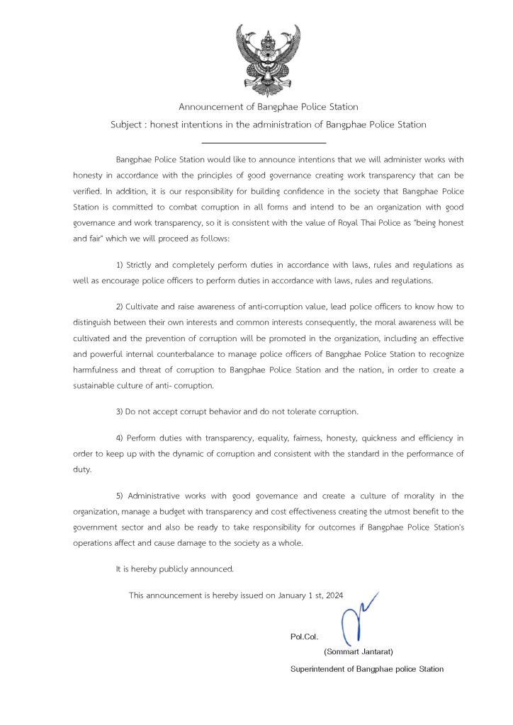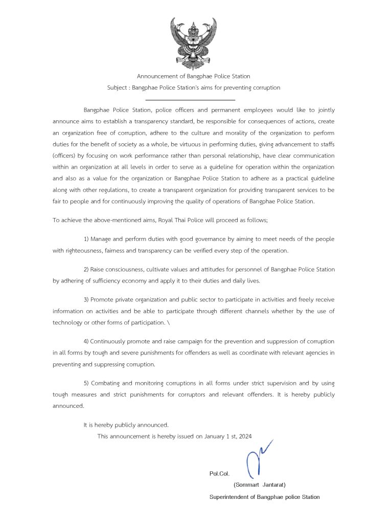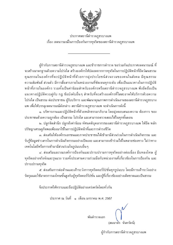ประกาศสถานีตำรวจภูธรบางแพ นโยบายต่อต้านการรับสินบน
