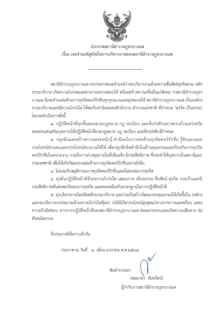 สถานีตำรวจภูธรบางแพ จังหวัดราชบุรี ประกาศเจตจำนงค์สุจริตในการบริหารงานของสถานีตำรวจภูธรบางแพ