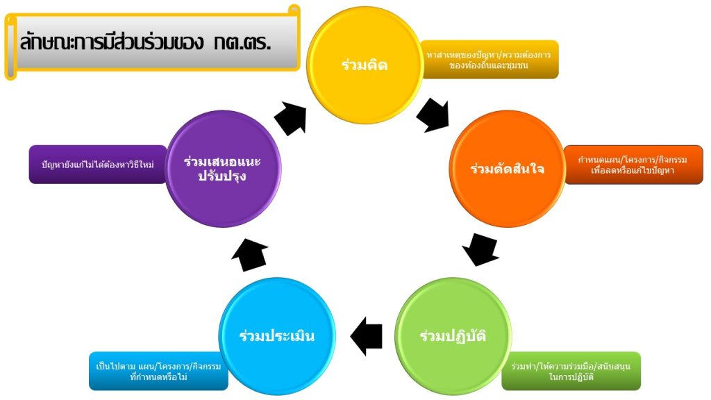 1) มีส่วนร่วมในการคิด ศึกษาและค้นคว้าหาสภาพและสาเหตุของปัญหาตลอดจนความต้องการของท้องถิ่นและชุมชน